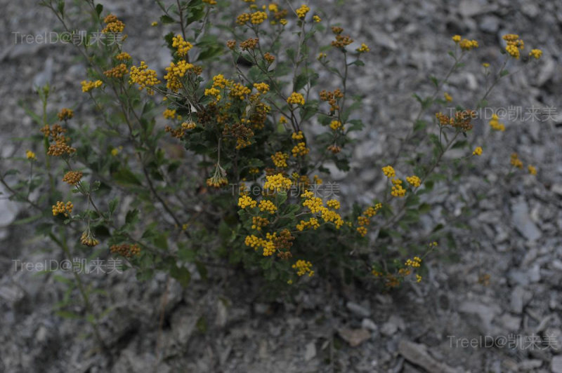 叶宽卵形或宽椭圆形,长1.5-2.5厘米,宽1-2厘米,边缘不规则三角形锯齿或3-5浅裂;叶两面异色,上面绿色或灰绿,下面灰白色,被密厚的短柔毛。头状花序小,多数在枝端排成直径2-8厘米的复伞房花序;花黄色。