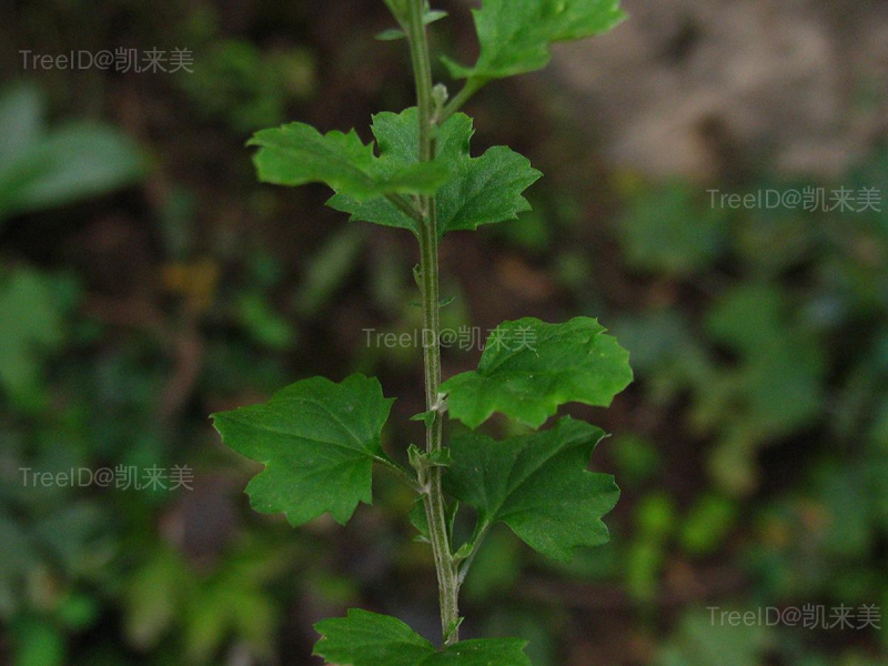 叶宽卵形或宽椭圆形,长1.5-2.5厘米,宽1-2厘米,边缘不规则三角形锯齿或浅裂。叶顶端急尖或截形。上部和接花序下部的叶小,匙形或长椭圆形。全部叶有长O.5厘米的叶柄,两面异色,下面被密厚短柔毛。