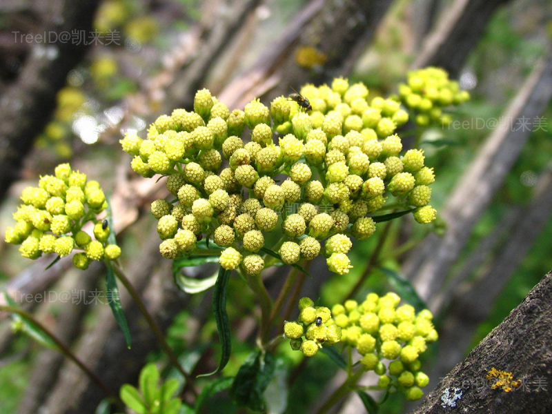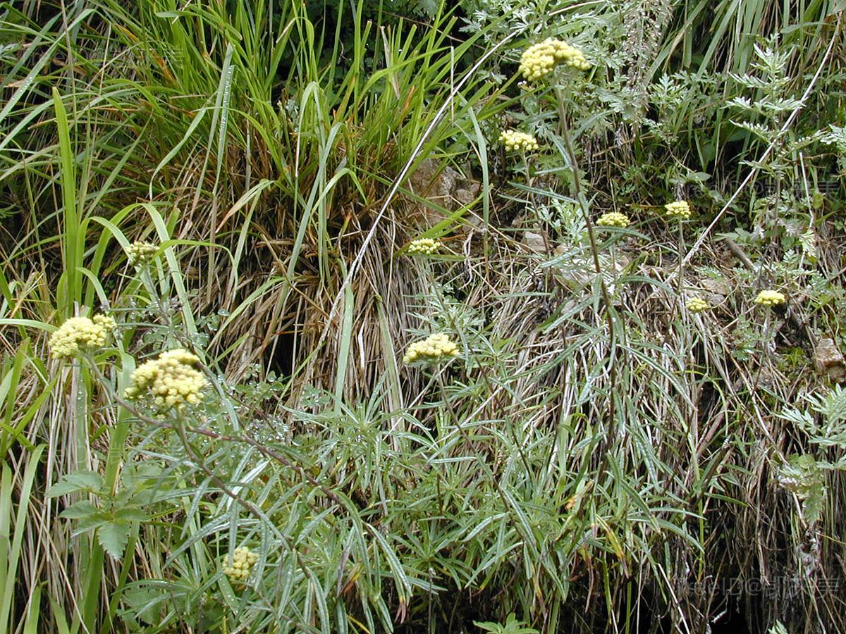 叶线形或披针形,长5-10厘米,宽3-10毫米,全缘;叶下面白色,被密厚的绢毛。头状花序黄色,多数在枝端排成密集的伞房花序。