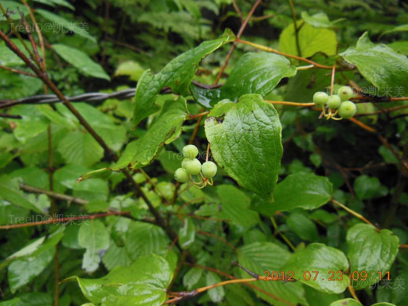 叶卵形或近圆形;叶柄长5-12毫米,向基部渐宽成鞘状。在叶下面的主脉和支脉的下半部或近基部,以及叶柄的上半部都具有乳突状毛。花单性,雌雄异株,绿黄色,有时淡红色,1-3朵或数朵排成伞形花序;总花梗纤细。浆果球形,熟时黑色。