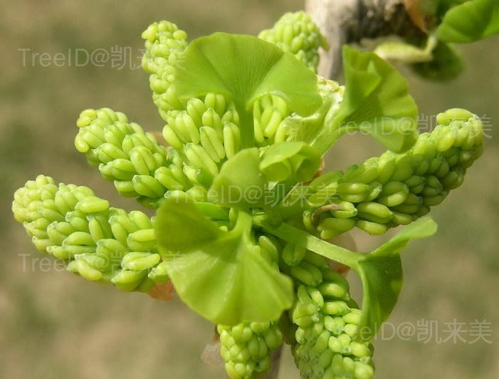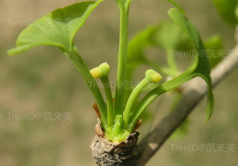 叶在长枝上互生,在短枝上簇生,具长柄,叶片扇形,先端常二裂。