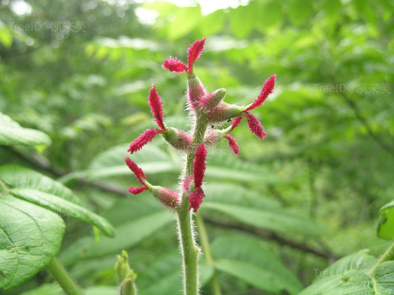 树皮灰色,浅纵裂。奇数羽状复叶大型,小叶9-19,长圆形,具细锯齿。雄柔荑花序腋生下垂,雌穗状花序于新枝顶生,具花4-10。核果卵球形,外果皮密被腺毛,果核具8条纵脊及雕刻状花纹。