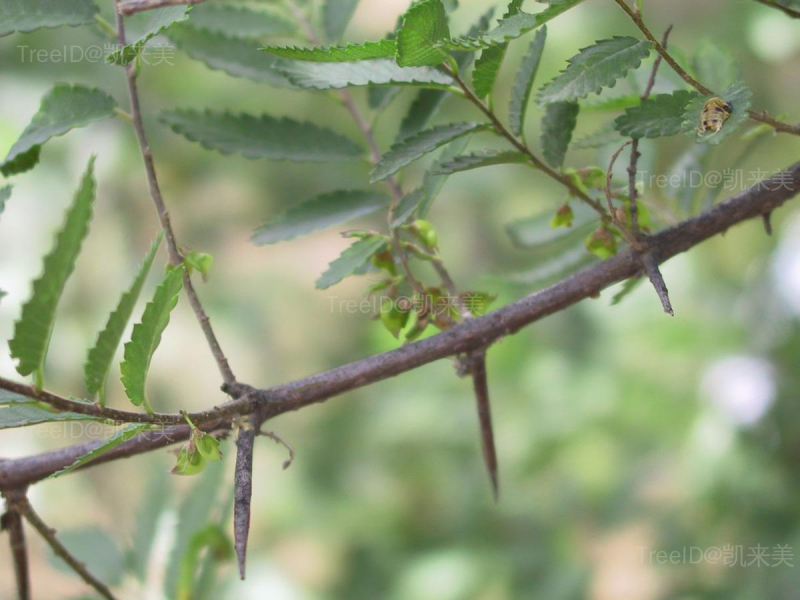 树皮暗灰色,不规则条状深裂。枝条灰褐色,具坚硬棘刺。叶互生,椭圆形,叶缘具整齐钝锯齿,羽状脉明显。花杂性同株,1-4朵簇生当年枝叶腋。小坚果卵形,具翅,扁平,偏斜。