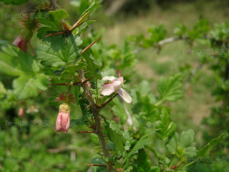 枝密生不等的细针刺,节刺粗长,3-7个。叶掌状3-5裂,裂片边缘具粗圆齿。花两性,1-2朵生叶腋;萼筒广钟形,裂片5,暗褐色;花瓣5,淡粉红色。浆果圆形,具多数黄色细针刺,萼裂片宿存。