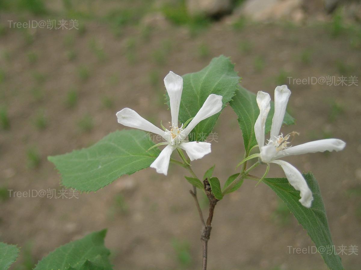 单叶对生,菱状卵形,边缘具不规则细锯齿,两面均有星状毛,并具中央射线。花常1-3朵,聚伞状;萼裂片5,密被星状毛,花瓣5,白色,雄蕊花丝上部有2钩状齿。蒴果扁球形,具宿存萼片。