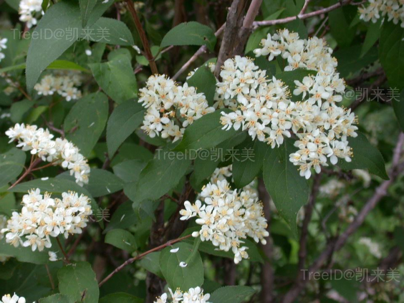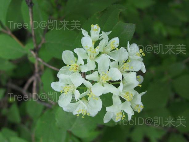 老枝树皮剥落。单叶对生,卵形至椭圆形,边缘具细密锯齿,两面均有星状毛,中脉上具白色长柔毛。伞房花序具多花;萼筒杯状,花瓣5,白色,雄蕊10,花丝扁。蒴果半球形。