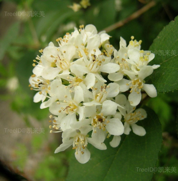 伞房花序具多花;萼筒杯状,花瓣5,白色,雄蕊10,花丝扁。