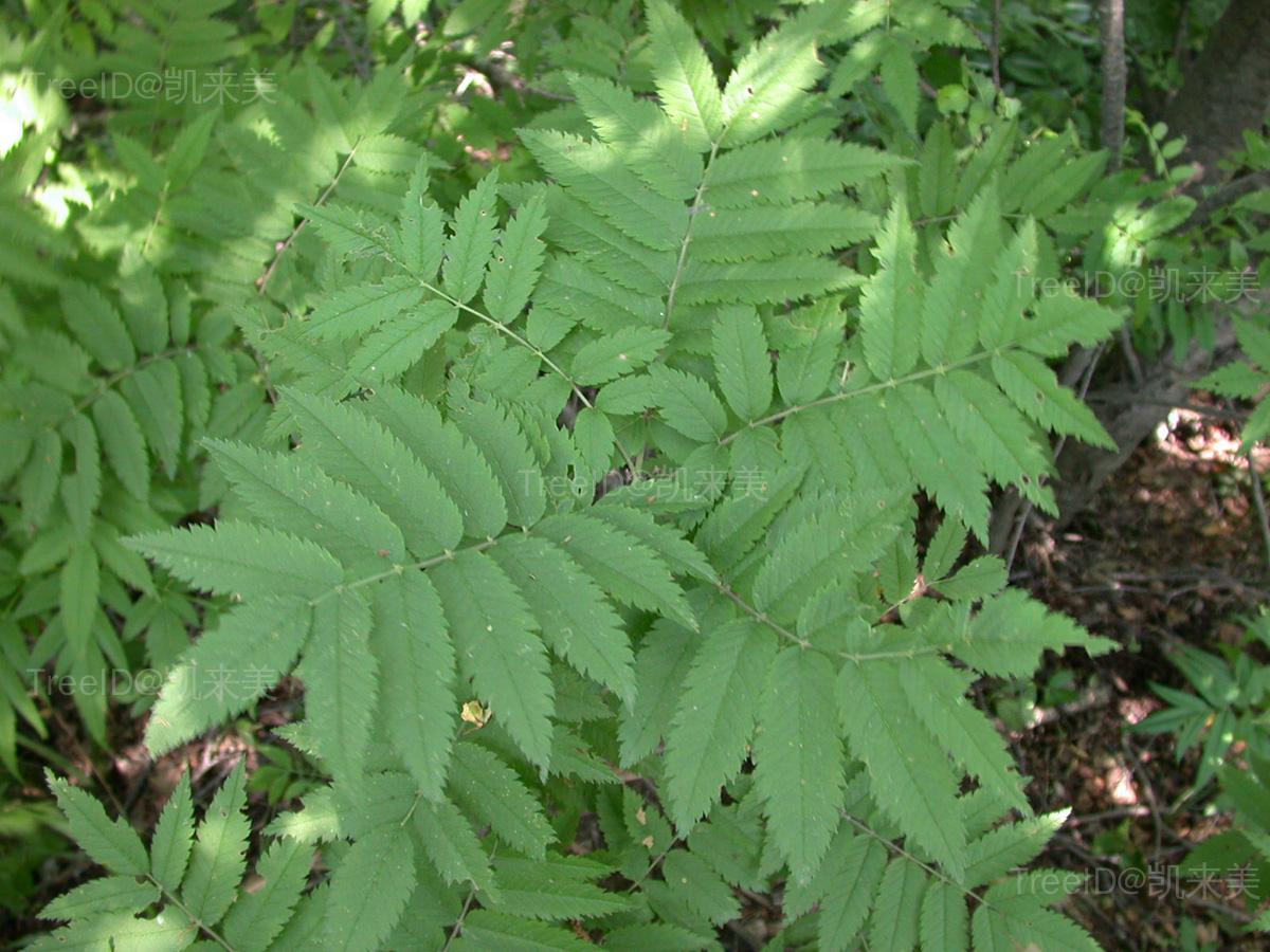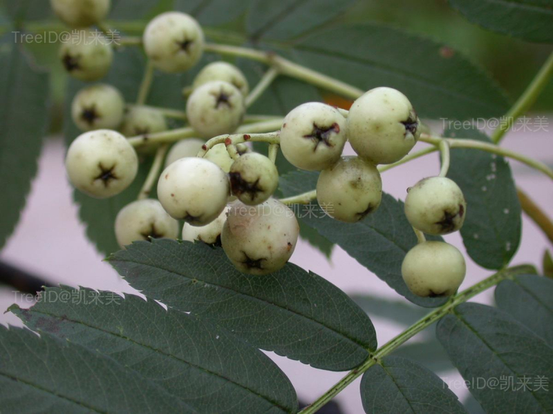 冬芽、叶背、花梗、萼筒均密被灰白色绒毛。奇数羽状复叶互生,小叶5-7对,中上部有细锐锯齿。复伞房花序,多花;萼筒钟状,萼片5,花瓣5,白色。梨果近球形,红色,具宿存萼片。