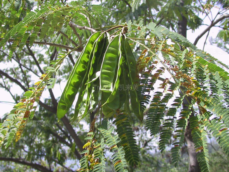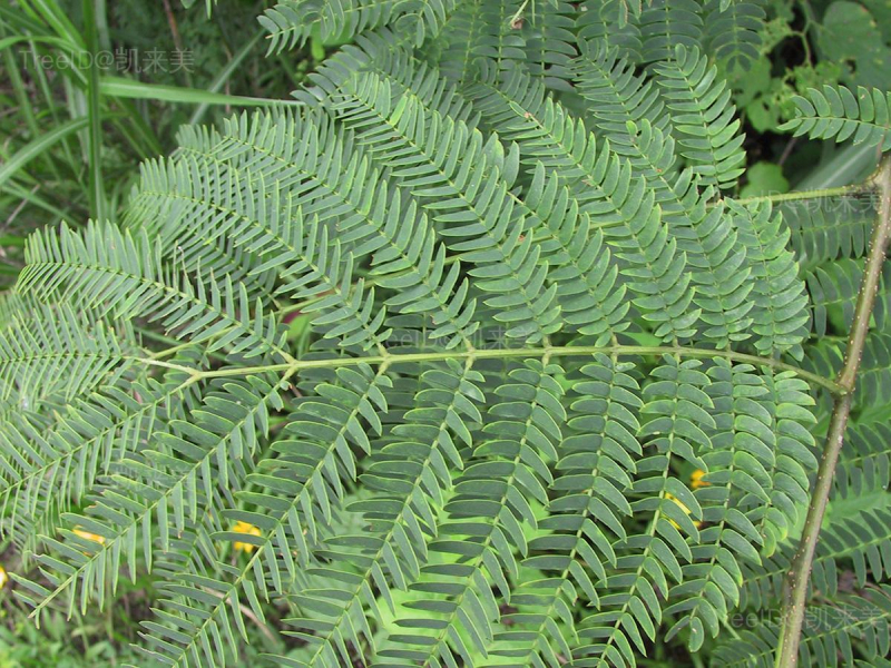 二回偶数羽状复叶互生,小叶镰刀形,长6-12毫米,中脉偏于一侧。