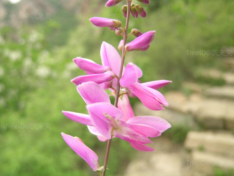 总状花序腋生,与复叶近等长;花冠蝶形,粉红色。