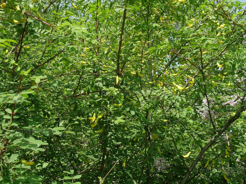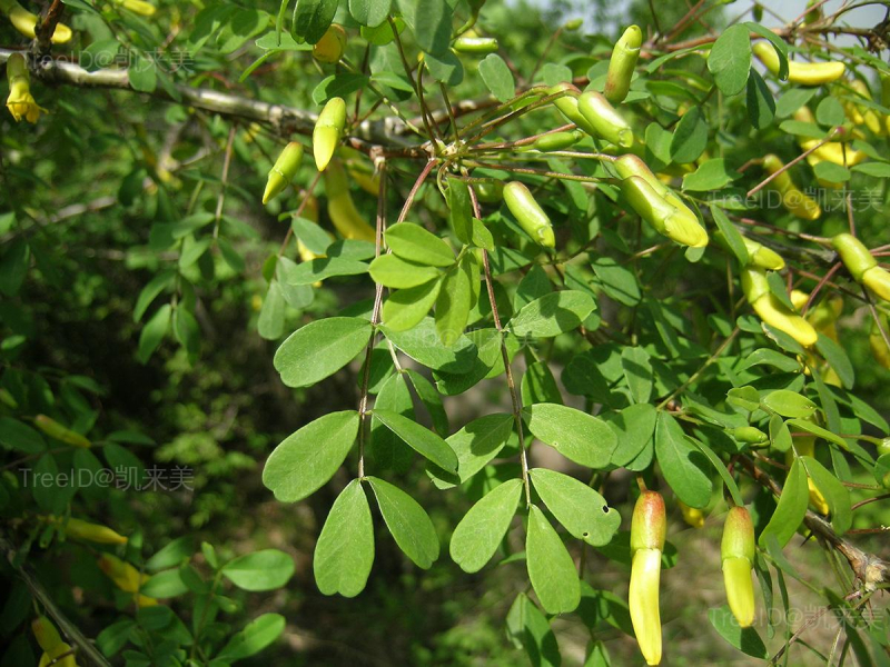 偶数羽状复叶,叶轴顶端具小刺尖,小叶10-14,长圆状卵形或长圆形,基部圆,先端圆形或截形,全缘。花2-4朵簇生于短枝上或单生,花梗具关节;花冠蝶形,黄色。荚果扁圆柱形,褐色,无毛。