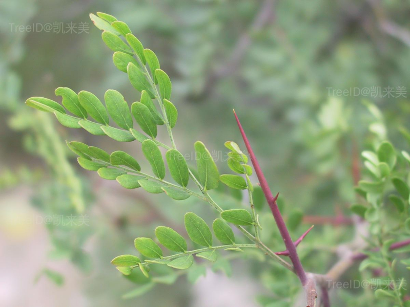 枝刺不分枝或有2-3个短分枝。一回和二回偶数羽状复叶生于同一枝上,小叶长圆形,全缘。穗状花序顶生或腋生;花杂性,花冠白色,具4花瓣。荚果斜椭圆形或斜长圆形,扁平,长3-5厘米。