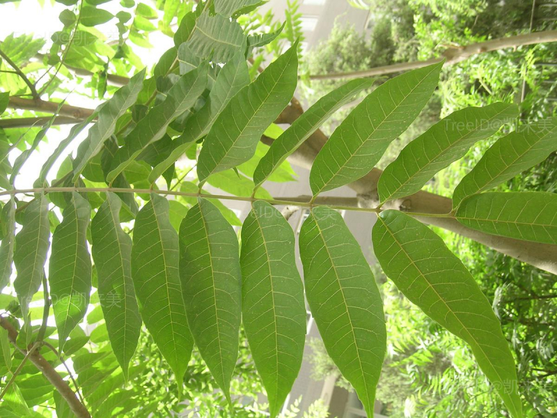 羽状复叶,嫩时暗紫色,有特殊气味,小叶5-10对,披针形,全缘。