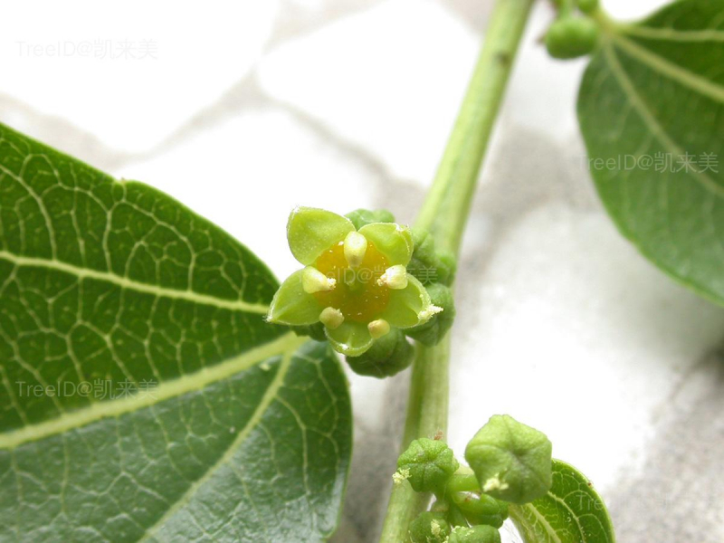 花小,2-5朵簇生,聚伞状,黄绿色,具花盘和蜜腺。