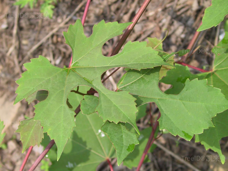 单叶互生,宽卵形,3-5中裂或不裂,基部心形或平截,叶缘具粗锯齿,表面光滑有光泽,背面苍白色。
