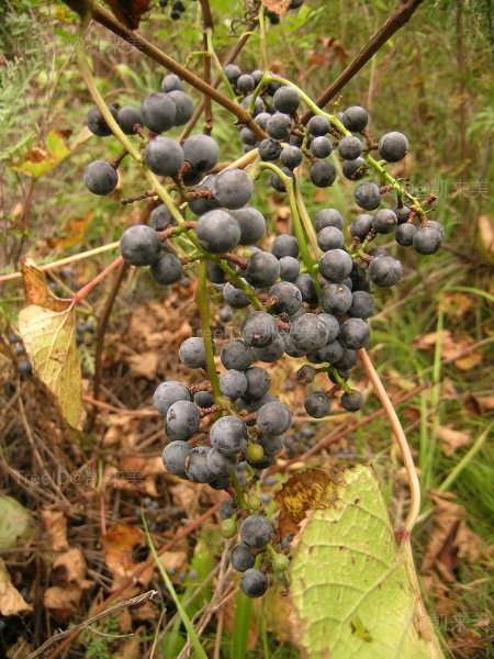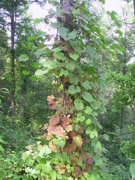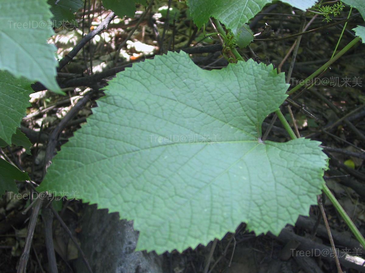 树皮暗褐色,成长片状剥离。卷须2-3分枝。单叶互生,宽卵形,基部心形,3-5裂或不裂,边缘具粗牙齿。圆锥花序,与叶对生,花序轴被白色柔毛;花雌雄异株,黄绿色,5基数。浆果球形,蓝黑色。