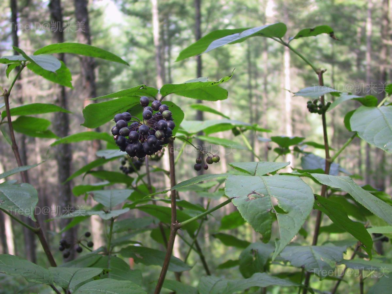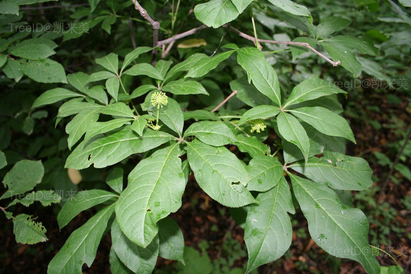 多分枝,密生向下的细直皮刺。掌状复叶互生,常具5小叶;叶柄具糙毛或生细刺。伞形花序单个顶生或2-6个组成圆锥花序;花紫黄色,5基数。浆果近球形,黑色,有5棱,具宿存花柱。
