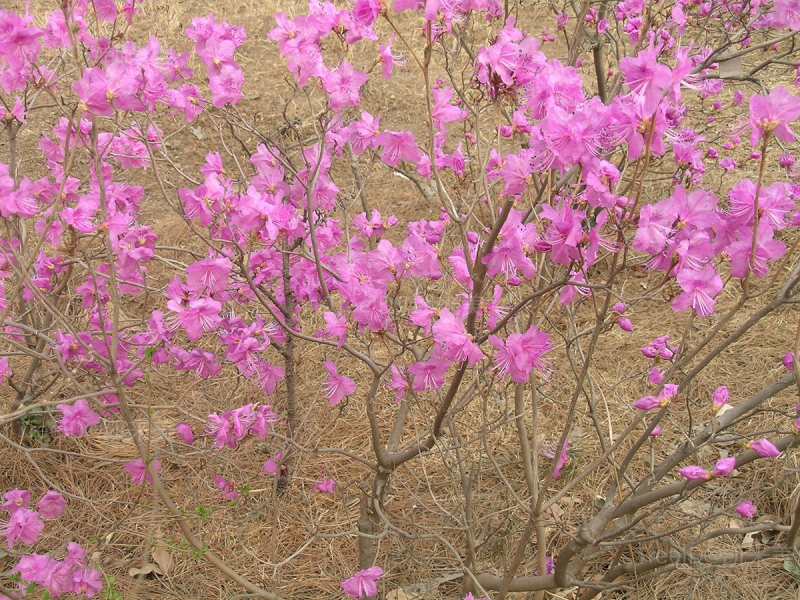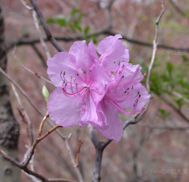 花单生或2-5朵簇生,先叶开花;花萼5裂,花冠漏斗状,淡紫红色,5裂。