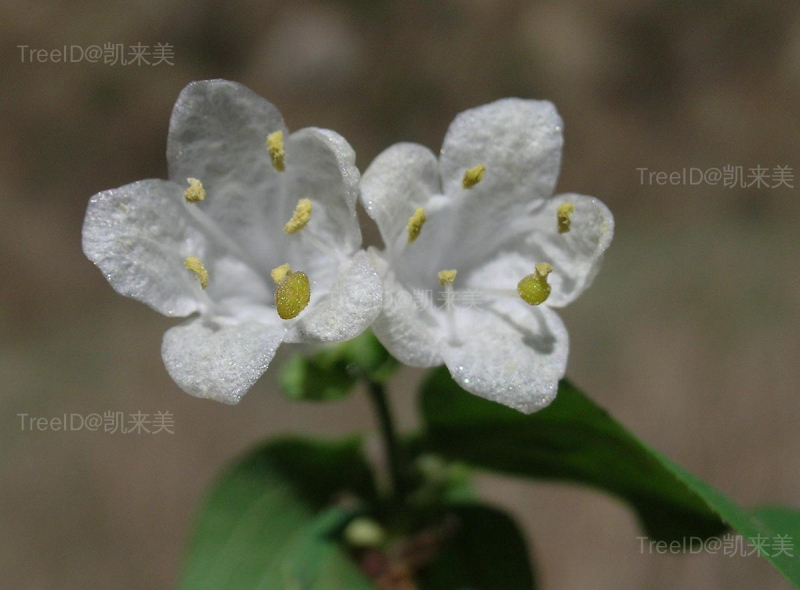 单叶对生,卵状椭圆形,全缘,边缘有纤毛。花成对生于叶腋,与花同时开放,相邻两花的萼筒分离;花萼5裂,花冠漏斗状,白色或粉红色,5裂,雄蕊5。浆果红色,椭圆形。