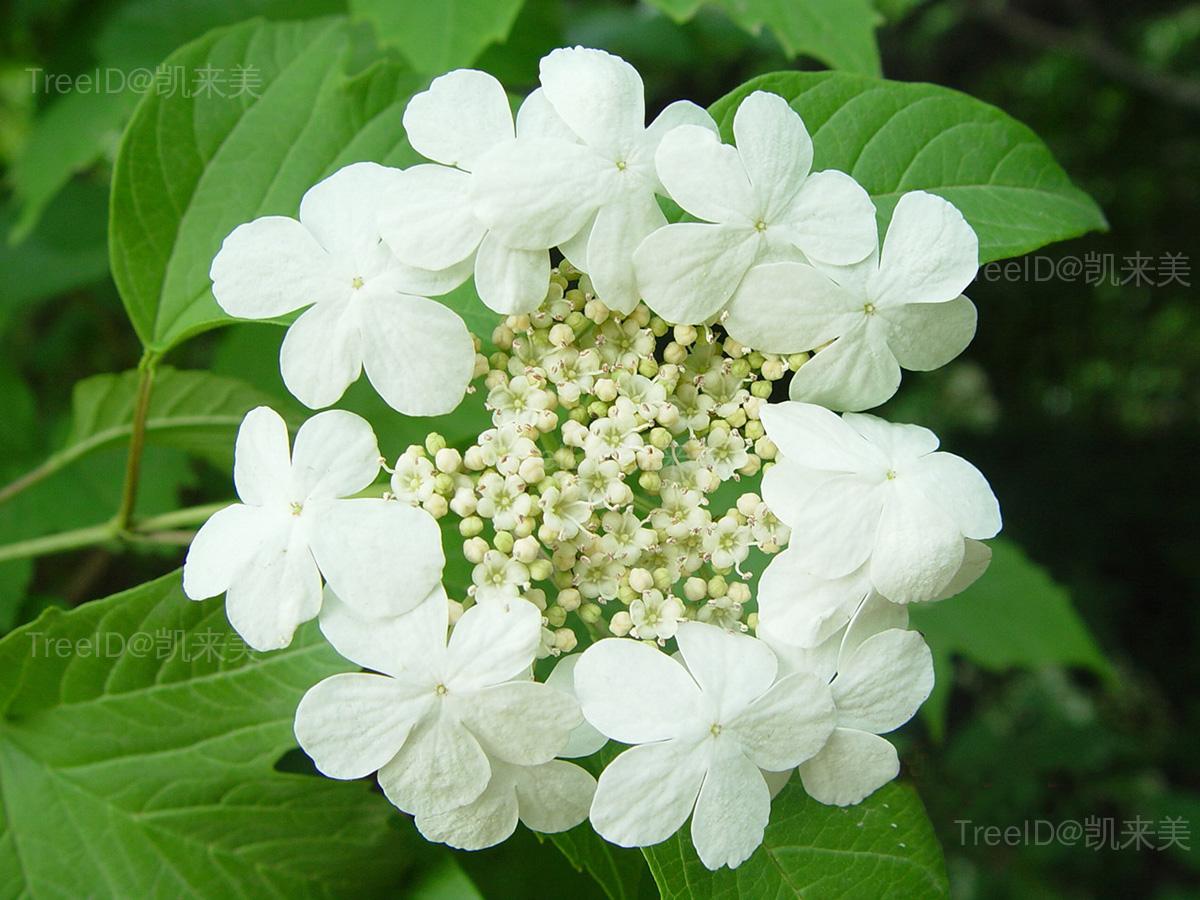 叶柄粗壮,上部有腺体。单叶对生,卵圆形,常3裂,裂片具齿。复伞形花序顶生,多花,边缘具大型白色不育花,内面为乳白色可育小花,花冠5裂。浆果球形,熟时红色。