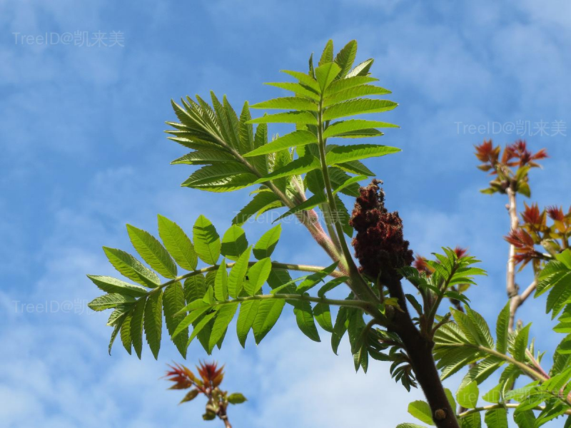 叶长椭圆状披针形,缘有锯齿,叶轴无翅。 雌雄异株,花淡绿色,有短柄;顶生圆锥花序,密生有毛。 果红色,有毛,密集成圆锥状火炬形。