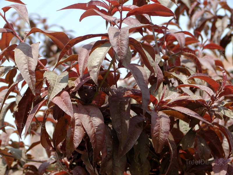 叶卵形或卵状椭圆形,紫红色。 花较小,淡粉红色,通常单生,叶前开花或与叶同放。 果小,暗红色。