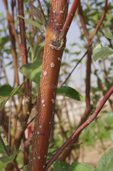 落叶灌木,高3米;树皮紫红色;枝血红色,无毛,常被白粉,髓部很宽,白色。