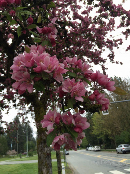 北美海棠是苹果属中果实较小(直径小于5cm) ,其枝、叶、花或果实具有较高观赏价值的种类的总称,包括多个种及种下变种和品种;北美海棠暮春繁花满树,花团锦族,色泽艳丽;花谢后结大量火红或者金黄的果实,一直可在枝头点缀到深冬。
