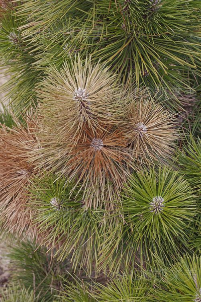 针叶2针一束,深绿色,有光泽,粗硬,长6-12厘米,径1.5-2毫米,边缘有细锯齿,背腹面均有气孔线;横切面皮下层细胞一或二层、连续排列,两角上二至四层,树脂道6-11个,中生。
