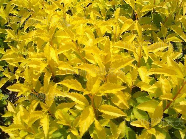 枝干丛生,枝开展,小枝黄色。叶对生,冠椭圆形或卵形,叶色从黄绿至黄色,枝叶较密。花黄色。蒴果卵形。