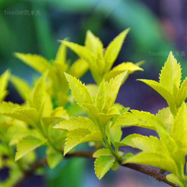 叶对生,冠椭圆形或卵形,长3-10厘米,叶色从黄绿至黄色,枝叶较密。