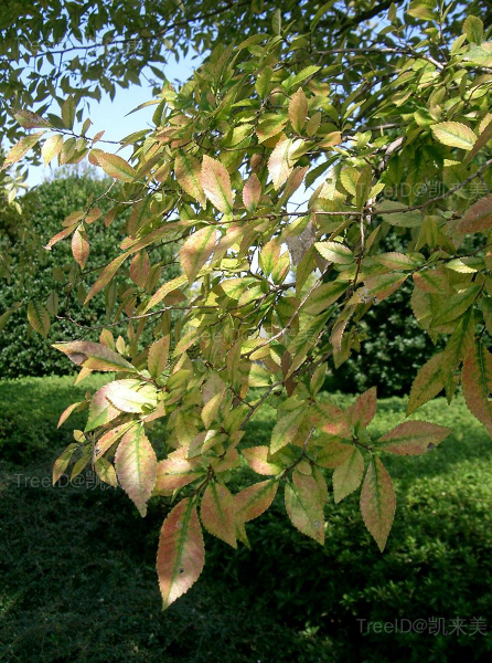 或冬季叶变为黄色或红色宿存至第二年新叶开放后脱落。叶质地厚,披针状卵形或窄椭圆形,稀卵形或倒卵形,中脉两侧长宽不等,长1.7-8(常2.5-5)厘米,宽0.8-3(常1-2)厘米,先端尖或钝,基部偏斜,楔形或一边圆,叶面深绿色,有光泽,除中脉凹陷处有疏柔毛外,余处无毛,侧脉不凹陷,叶背色较浅,幼时被短柔毛,后变无毛或沿脉有疏毛,或脉腋有簇生毛,边缘从基部至先端有钝而整齐的单锯齿,稀重锯齿(如萌发枝的叶),侧脉每边10-15条,细脉在两面均明显,叶柄长2-6毫米,仅上面有毛。