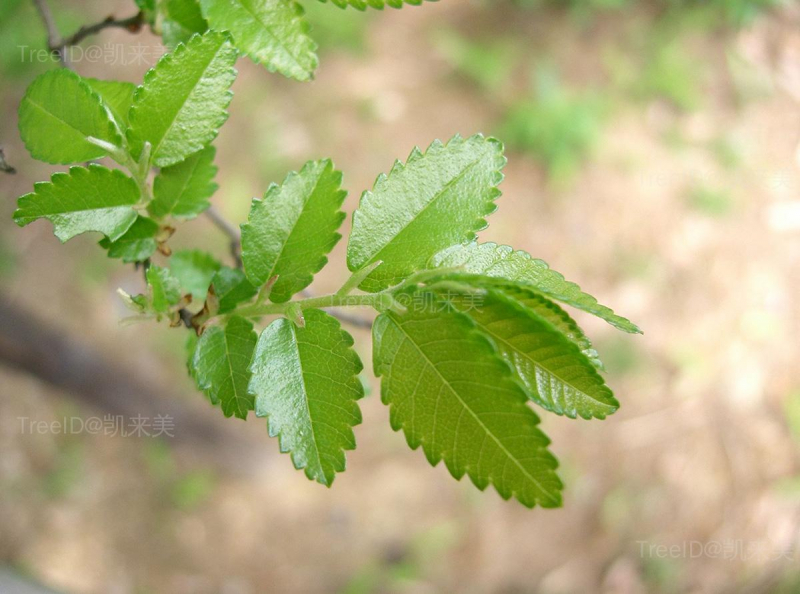 叶质地厚,椭圆形、卵形或倒卵形,边缘具单锯齿,上面光滑无毛,下面幼时被毛。或冬季叶变为黄色或红色宿存至第二年新叶开放后脱落。花秋季开放,聚伞花序,花梗极短,被疏毛。翅果椭圆形或卵状椭圆形,几无毛。