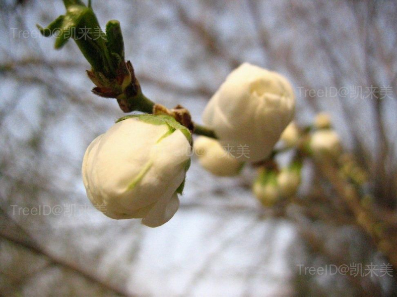 树皮光滑,深灰色或暗红褐色。小枝细长,黄褐色。花白色,花蕾卵形,花瓣卵形,复瓣,梅花型。叶绿色,椭圆披针形;叶缘细锯齿。