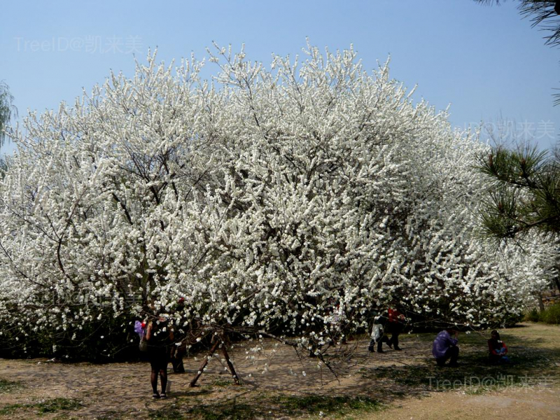 花白色,花蕾卵形,花瓣卵形,长1.83厘米,花径4.3厘米,复瓣,梅花型,花瓣数18枚(16-23);雄蕊数平均73.5,花丝长1.83厘米,雄蕊与花瓣近等长,花药黄色;无雌蕊;着花密;花梗长0.53厘米;萼片绿色,两轮,卵状;花丝和萼片均有瓣化现象。花期在所有桃花品种中最早,在北京地区4月上旬即可盛花。