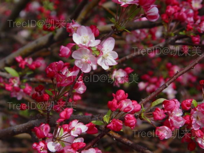 树形紧凑。新叶红色。花单瓣,深粉色,果亮红色。
