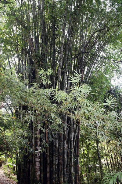 竿高20-30米,直径20-30厘米,直立,梢端下垂或长下垂,节处不隆起;节间长30-45厘米,壁厚1-3厘米,幼时在外表被有白蜡粉;竿分枝习性高,每节分多枝,主枝常不发达。竿箨早落;箨鞘大形,厚革质,鲜时带紫色,全缘,背面贴生暗褐色刺毛;箨耳与下延之箨片基部相连,多少有些外翻,以后易脱落;箨舌显著,高6-12毫米,边缘有短齿状裂刻;箨片外翻,卵状披针形,长13-38厘米,其基部约占箨鞘顶端的4/5。
