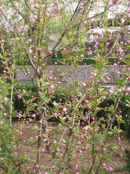 嫩枝、嫩叶均带紫红色,花粉红色,下垂,早春期间甚为美丽,各地常见栽培供观赏用,有重瓣、白花等变种。