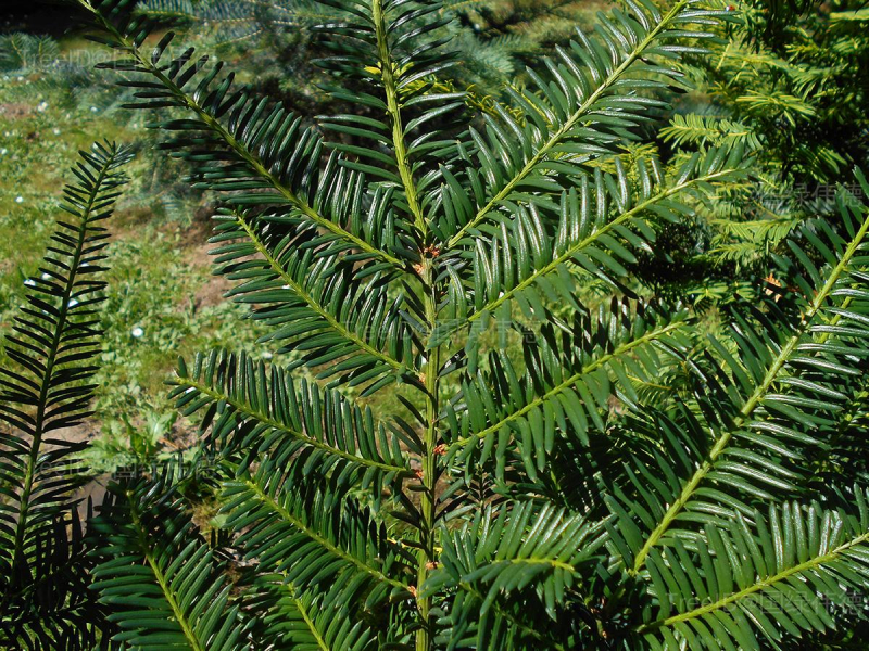 叶线形,直或弯微,较紫杉密而宽,先端常突出,正面深绿色有光泽,叶背后面有两条灰绿色气孔带;主枝上的叶呈螺旋状排列;侧枝上的叶呈不规则的、端面近于“V”字形羽状排列。