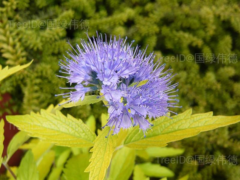 枝条圆柱形。单叶对生,叶长卵形,叶端尖,基部圆形,边缘有粗齿。叶面光滑,鹅黄色,叶背具银色毛。聚伞花序紧密,花萼钟状,花冠、雄蕊、雌蕊均为淡蓝色,花紫色。