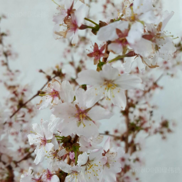 冬芽无。叶卵形或卵状披针形,上面无毛,下面淡绿色,无毛或脉有稀疏柔毛。花蔟生,花叶同放或先叶开放;花瓣白或粉红色,倒卵状椭圆形。核果近球形,熟时深红色,核光滑。